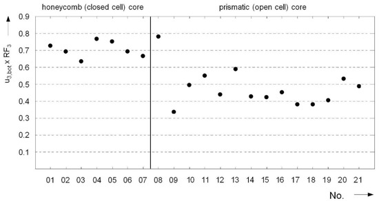 During loading, these cell components are primarily subjected to bending stresses [29]. In addition, closed cells usually have very low relative membrane load-bearing capabilities and fail due to the rapid onset of buckling or cracking effects [30]. Imperfections, defects, and inhomogeneities caused by the manufacturing process lead to the comparatively low mechanical strength and stiffness of foam cores [31]. Many analyses of this foam’s properties, the parameters that can be used to adjust its mechanical properties, and its use in sandwich construction exist in the literature. Therefore, foam cores are not the subject of this study.