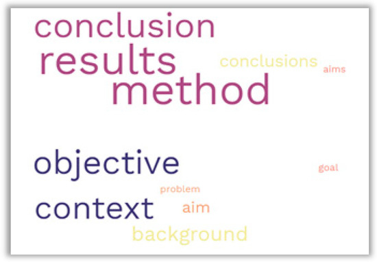 To answer RQ6, we relied on the answers to questions 11 that we collected from the analyzed review abstracts (when applicable). Recall from above that question 11 focused on identifying the various keywords that the systematic reviewers often use to structure their review abstracts. This allowed us to generate a word cloud depicting the most frequent keywords used to structure review abstracts.
