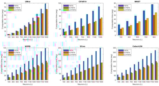 The proximal step of FISTA requires the main computational effort, and this also holds true for G-FISTA and LC-FISTA. The additional computation required in G-FISTA and LC-FISTA increases the convergence speed, but the execution cost is higher. However, this problem can be controlled, since G-FISTA and LC-FISTA converge with fewer iterations. In the experimental evaluation described in Section 4, we raised the complexity of the problem by increasing the number of neurons in the hidden layer to get a clearer idea of the performance when solving applications involving higher dimensional datasets. Based on this evaluation criterion, we see that the proposed method can be configured to solve large-scale problems, since the vector operations involved in the ELM-AE architecture and the proposed mechanism are block-separable.