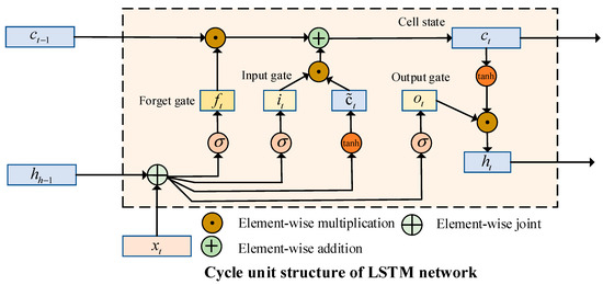 As can be seen from Figure 2, three gate units—an input gate, output gate, and forget gate—were used in the LSTM unit to control the information transfer. Usually, the time series data of each time step and the previous hidden state are used as the input for the LSTM unit. The input gate, , can control the current moment of the candidate status, , which needs to save the information; the forget gate, , can control the internal state, , of the last moment, which needs to discard information; the output gate, , can control the internal state’s, , output information to the external state, , at the current moment.