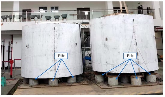 ① Pile: One acceleration sensor was arranged in the x-, y-, and z-directions at the pile head of the tank;