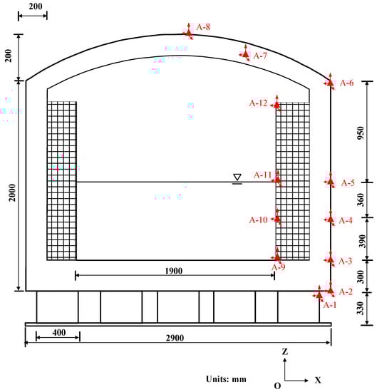 ③ Outer tank: there were seven measurement points in the tank and its dome (two measurement points in the dome and five measurement points in the tank along the height direction), and one acceleration sensor was arranged the x-, y-, and z-directions for each measurement point. The layout of the acceleration sensors is shown in Figure 5.
