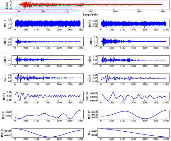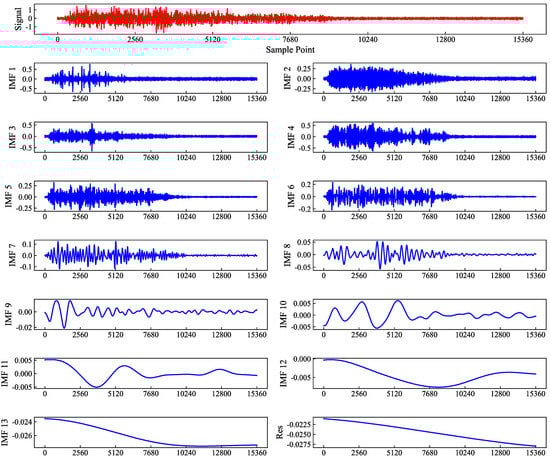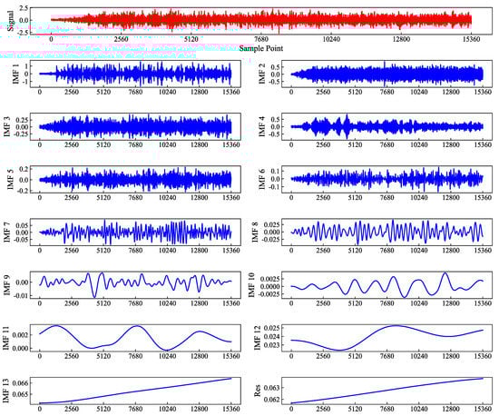 The EEMD algorithm can decompose the original measured acceleration data into several IMF components and an RES residual sequence, where the IMF components can reflect the frequency domain characteristics of the original acceleration signal with time, and the EEMD decomposition signal does not need to be predetermined or forced to give the basis function in advance but relies on the signal itself to be decomposed adaptively. Therefore, the feature information of the original signal can be extracted effectively. The EEMD decomposition results of the three datasets are shown in Figure 7, Figure 8 and Figure 9. In each picture, the x-axis represents the sampling points, the y-axis represents the EEMD decomposition values, and the IMF components are listed in the order of frequency extraction from high to low.