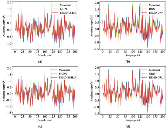 EEMD decomposes the measured signal data into multiple modes, which can reduce the nonlinear variations in the signal and improve the time series prediction accuracy. In the first experiment, four algorithms (i.e., BiGRU, GRU, LSTM, and DNN) were selected for analysis to evaluate the EEMD model’s performance. BiGRU, GRU, LSTM, and DNN were the traditional methods for predicting missing data using the original measured acceleration data. Furthermore, EEMD-BiGRU, EEMD-GRU, EEMD-LSTM, and EEMD-DNN were the hybrid prediction methods based on the EEMD proposed in this paper to predict the missing data by inputting the raw measured acceleration decomposition subsequence into the model. To illustrate the effectiveness of the hybrid prediction method, tests were conducted on three different datasets using the above algorithms, and the test results are shown in Table 2, where Point 1 represents one point missing from the original dataset.