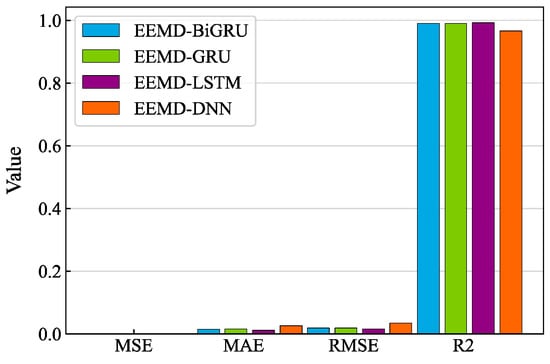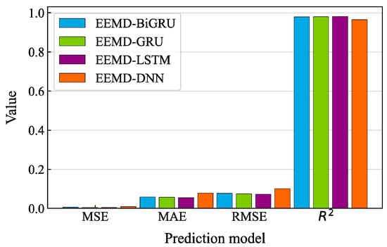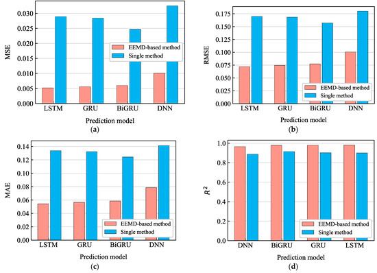 Above is the modeling process as shown using the EEMD-LSTM model as an example; other types of deep learning algorithms can be chosen above; in this paper, the LSTM deep learning model was used and compared with the deep neural network (DNN), gated recurrent unit (GRU), and bidirectional gated recurrent unit (BiGRU). The hybrid methods are denoted as EEMD-LSTM, EEMD-DNN, EEMD-GRU, and EEMD-BiGRU.