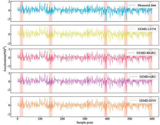 Using the original acceleration data of the tank in the Chongqing University shaking-table lab, the performance of the EEMD-LSTM method proposed was compared with some traditional deep learning prediction methods. The sampling frequency of the dataset’s acceleration sensor was 256 Hz, collecting raw data every 0.0039 s. All experiments in this study only compared the performance of the various prediction methods. There was no need to use the complete data of all working conditions. Therefore, the data can reflect the structural power characteristics to evaluate the proposed method’s performance.