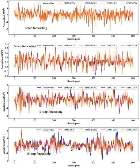 The predicted results for the El-Centro dataset using eight algorithms, including EEMD-BiGRU, EEMD-GRU, EEMD-LSTM, EEMD-DNN, BiGRU, GRU, LSTM, DNN, are shown in Table A1. Figure A1 shows the multi-step prediction results using different algorithms on the El-Centro dataset including 1, 5, 10, and 15 steps. The variation in the evaluation metrics of the EEMD-based model with an increasing step size can be seen in Figure A2.