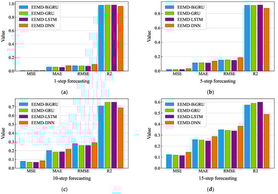 The predicted results for the RG dataset using seven algorithms, including EEMD-BiGRU, EEMD-GRU, EEMD-LSTM, EEMD-DNN, BiGRU, GRU, LSTM, and DNN, which are shown in Table A2. Figure A3 shows the multi-step prediction results using different algorithms on the RG dataset including 1, 5, 10, and 15 steps. The variation in the evaluation metrics of the EEMD-based model with an increasing step size can be seen in Figure A4.