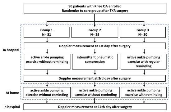 This study was a cluster randomized controlled trial that compared lower leg circulation using different approaches. Ninety patients undergoing traditional TKR surgery between 1 January to 31 December 2020 at Chang Hua Show Chwan Memorial Hospital were enrolled in this study. The eligibility criterion was unilateral primary TKR for knee osteoarthritis. Patients with a history of cardiovascular disease, such as DVT, dyslipidemia, hypertension, myocardial infarction, and hemorrhagic disease, were excluded from this study. Patients were allocated to three groups, namely, groups 1, 2, and 3, in a 1:1:1 ratio, based on the participation date. Patients who participated in the same period were assigned to only one group [21]. However, one patient was moved from group 2 to group 1 because of bleeding with intermittent pneumatic compression at the beginning of postoperative nursing care. Finally, there were 31, 29, and 30 patients in groups 1, 2, and 3, respectively.