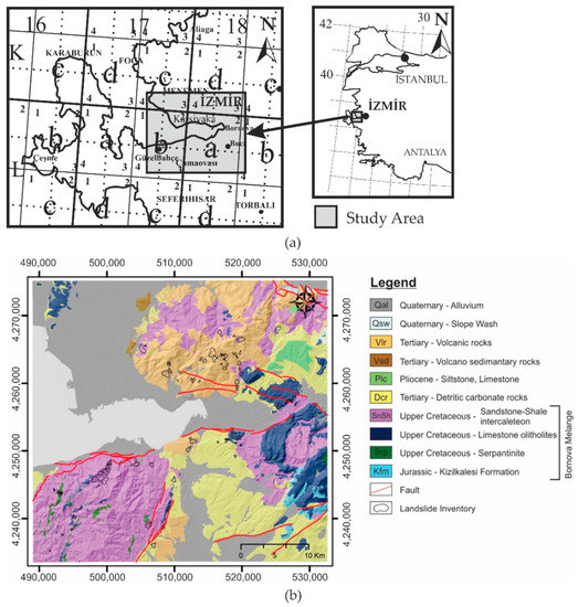 Geologically, the rock units can be grouped into three main groups: Bornova mélange, Neogene sediment and Yamanlar volcanic rock. Apart from these three groups, alluvium and slope debris continue to be deposited [72]. The matrix of Bornova mélange rocks located within the tectonic belt called the Izmir–Ankara Zone is composed of Upper Cretaceous–Paleocene sandstone–mudstone intercalations. In the matrix consisting of sandstone–shale intercalations, limestone, serpentinite, chert and diabase blocks of various sizes ranging in age from the Triassic to the Cretaceous can be found [73,74] (Figure 1b).
