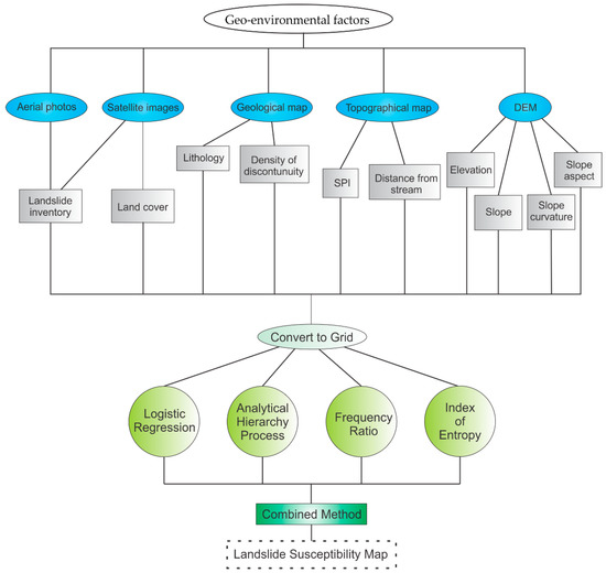This study aims to produce an LSM of the Izmir metropolitan area. First, a landslide inventory map concerning past landslides was created to show the probability of new landslides. Then, the factors that could impair stability (slope angle, slope aspect, lithology, general curvature, elevation, density of discontinuity, stream power index, land use and distance from stream) were selected and those factors were standardized with fuzzy logic [34]. The grid resolution used was 25 × 25 m during the analyses. After standardization, LSMs were produced using together with standardized factors and landslide inventory, using the LR, AHP, FR and IOE methods. In the last stage, the final LSM was produced using the combined method to integrate these four LSMs (Figure 2).