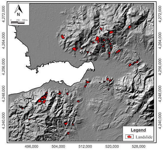 Landslide inventory is the most crucial parameter of landslide susceptibility mapping, since it establishes the connection between landslide formation and the factors causing this landslide. Chung and Fabbri [78] explain this relationship, noting that “The landslide that occurred due to considered influencing factors will shed light on the formation of new landslides in the future due to the same factors.” LSMs can be created by mapping along the borders of the landslide in the field, as well as by remote sensing methods with the help of satellite and aerial photographs [58,79,80]. In this study, the inventory maps created by Avsar [81] and the General Directorate of Mineral Research and Exploration (GDMRE) [82] are combined and enriched with remote sensing data (Figure 3).