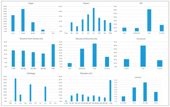 Conditions that disturb the balance when the rock mass is stable can be defined as geo-environmental factors. Understanding the role of predetermined conditions for landslides is critical to determining the susceptibility of landslide formation [83,84,85]. For this reason, the correct selection of geo-environmental factors is of great importance in the accuracy of the final LSM being prepared [86]. We can categorize geo-environmental factors into four groups according to their source: geomorphological, geological, hydrological and human. The first three factors relate to causes that are independent of any external effects and occur in completely natural ways. Human factors, on the other hand, are non-natural activities that can disturb stability via the application of surcharge loading on slopes that would otherwise remain stable in nature, for example, via excavation, construction or engineering of the structure in ways that disrupt its stability. In the preparation of the LSM for this study, slope angle, slope aspect, elevation and curvature were taken as geomorphological factors; lithology and density of discontinuity factors as geological factors; stream power index and distance from stream as hydrological factors; and land use as a human factor were used (Table 1). Geo-environmental factors and associated percentages of landslides are given in Figure 4 and Figure 5.