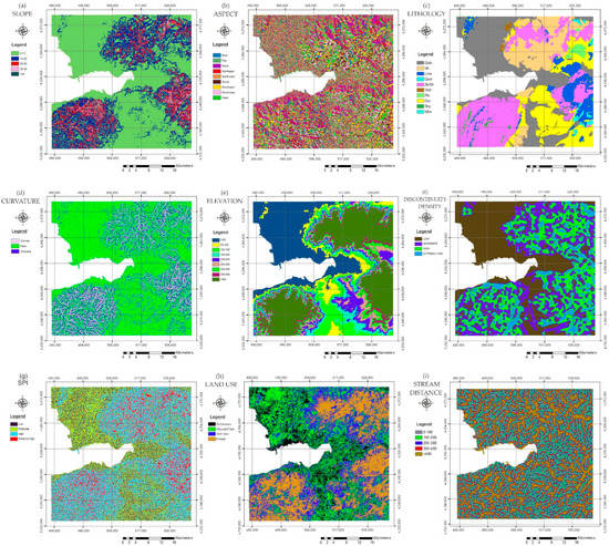 Geo-environmental factors: (a) slope, (b) slope aspect, (c) lithology, (d) slope curvature, (e) elevation, (f) density of discontinuity, (g) SPI, (h) land use, (i) distance from stream.