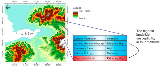 Various methods have been developed in many landslide susceptibility studies, and countless studies have been conducted using these methods. Investigating these studies, it is clear that each method has advantages and disadvantages. The combined method was developed to minimize the errors that these disadvantages might cause. The logic behind the method is that superimposing LSMs created using various methods will result in a susceptibility map with the highest reliability. The combined method procedure involves assigning each pixel the highest landslide susceptibility score among all the data obtained for that pixel from the LSMs prepared using different methods for a specific geographical point (Figure 6). The aim here is to conduct more reliable studies and minimize the risk of errors by choosing the higher susceptibility value as the landslide susceptibility of a certain pixel where method “A” indicates low susceptibility and method “B” indicates high susceptibility. In order to prepare an LSM with the combined method, it is necessary to prepare LSMs based on between two and four methods and overlay these maps. The results obtained indicate that the combined method yields the greatest reliability when the highest number of susceptibility maps prepared with different methods are overlaid. However, using more than four methods is considered not to lead to higher reliability, therefore a maximum of four methods for preparing LSMs should be used and the combined method should be applied with these maps.