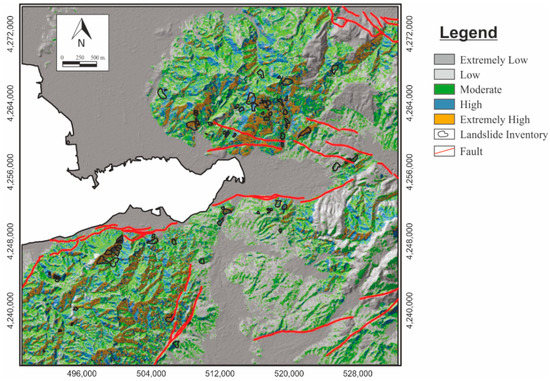 For analysis with LR, in order to determine the probability of landslide occurrence in a certain area, probability was calculated using Equation (1) and the file was converted to raster format to obtain an LSM. The probability of landslide occurrence is given as a value between zero (0) and one (1), and the LR map has a pixel size of 25 × 25 m. The LR-based map classified the data into five groups, from extremely low to extremely high (Figure 7).