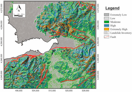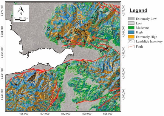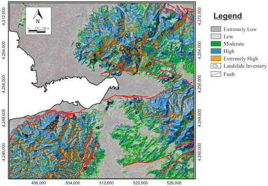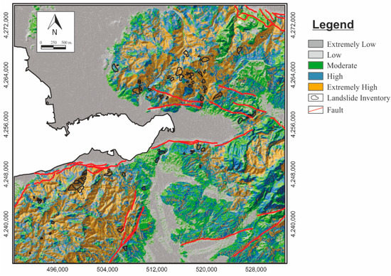 In cases where these calculated FR values are less than 1, the effect of this parameter on landslides may be low. In cases where it is greater than 1, the effect of this parameter on landslides can be considered high. FR values for causative factors are given in Table 5. In this study, the LSM based on the FR method was classified using the natural breaks method and divided into five classes, from extremely low to extremely high (Figure 9).