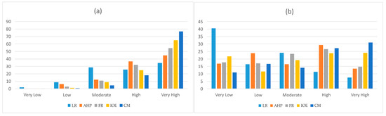LR, AHP, FR and IOE are the most frequent four methods selected in recent landslide susceptibility mapping studies. Four different LSMs were prepared using these methods and overlaid using ArcGIS Spatial Analyst Tools. Then, all pixels were reclassified in the study area after choosing the pixel value with the highest landslide susceptibility among to the four methods (Figure 6). As a result of this combined method classification process, the final LSM was classified according to five groups, from lowest susceptibility to highest (Figure 6).