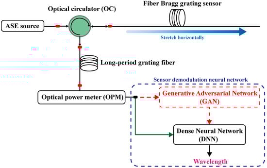 The proposed FBG demodulation system as shown in Figure 1. The laser in the C + L band emitted by the ASE light source (BBS, 1528–1603 nm) passes through the annulus into the FBG sensor to be measured. The light reflected by it is delivered to the LPG used for demodulation. In this case, the overlapping area between the reflected spectrum of the FBG sensor and the spectrum of the LPG sensor is considered the transmitted intensity. According to the edge filtering method, the change in transmitted intensity due to the change in the central wavelength of the FBG sensor caused by external perturbations is the key to dynamically interrogating the central wavelength of the FBG sensor. The transmitted intensity is captured by the optical power meter and fed back to the sensor demodulation neural network, which completes the absolute interrogation of the central wavelength of the FBG sensor in the case of horizontal stretching.