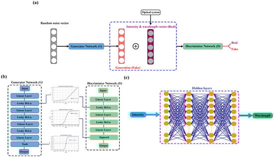 Generative Adversarial Network (GAN): A prerequisite for machine learning algorithms to achieve acceptable results in modeling various types of nonlinear relationships is the availability of large-scale datasets, which are time consuming and laborious to collect. We proposed using GAN to perform offline, noninvasive augmentation of the original dataset before DNN training. GAN, first presented by Goodfellow et al. [32], is an adversarial model widely used in image generation. The overall structure of our proposed GAN for data augmentation is shown in Figure 2a. The GAN consists of a generator (G) and a discriminator (D), two independent networks; their specific structures are shown in Figure 2b. The G receives a random noise and generates a vector similar to the input data. This generated vector is then dimensionally superimposed with the actual data vector from the optical system and sent to the discriminator for training. The D is used to determine the authenticity of the data it receives, where “Real” means that the data distribution is close to the actual data. In contrast, “Fake” means that the data generated by the G deviate from the actual data distribution. During training, G tries to deceive D, while D tries not to be fooled by the G. The performance of both models can be improved after alternate optimization training, and the ultimate goal of training a GAN is to obtain a generative model with optimal performance, from which the data generated can be infinitely close to the actual distribution. Explicitly, the training of the GAN is a “min-max” game that gradually converges through the optimization of a loss function that is designed for G and D. Theoretically, the smaller the loss, the higher the model’s performance. Specifically, the loss function is defined as Equation (3).