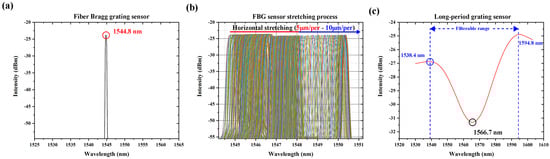 where is the Bragg wavelength reflected by FBG, is the effective refractive index (RI) of the fiber core, and denote the grating spacing. The value of and the effective RI change when the FBG is subjected to strain, thus changing . LPG is a transmission grating with loss peaks at specific wavelengths in the transmission spectrum. The falling and rising edges of the LPG spectrum can be used to interrogate the FBG, i.e., the wavelength drift, which is converted to the peak power shift of the FBG. When some perturbation (e.g., strain) is applied, the peak of the FBG is shifted, and accordingly, the output of the photodetector is changed. The power detected by the photodetector can be estimated as Equation (2) [31].
