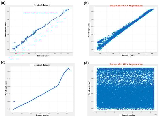 Data augmentation results of the GAN. (a,b) are the original dataset and the GAN-enhanced dataset, respectively, with the intensity in the LPG spectrum on the x-axis and the central wavelength of the FBG on the y-axis. (c,d) are the original dataset and the GAN-augmented dataset, respectively, with the number of dataset samples on the x-axis and the central wavelength of the FBG sensor on the y-axis.