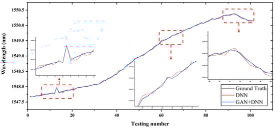 The dataset acquired in the additional continuous stretching experiments was selected as a test dataset for the well-trained model, and the test results are shown in Figure 5. In addition, the wavelength demodulation error distribution using DNN alone and the combination of GAN and DNN are shown in Figure 6. The demodulation error was used to reflect the system’s precision, defined as the difference between the wavelength interrogated by the system and the wavelength measured by the OSA. The wavelength interrogation of the FBG sensor using DNN alone has a demodulation error distribution in the range of ±0.03 nm. The demodulation error is within ±0.006 nm when the GAN and DNN were combined, which means that the combination of GAN+DNN can achieve pm-level wavelength interrogation precision. In summary, the superiority of the proposed demodulation system in demodulation performance was demonstrated.
