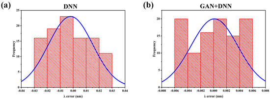 Histogram of wavelength demodulation error distribution. (a) Error distribution of the DNN. (b) Error distribution of the DNN + GAN (our proposal).