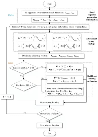 The W-ChOA combines the advantages of these two algorithms. Compared with the ChOA, the search accuracy and convergence speed of the W-ChOA have been significantly improved. The flowchart of the W-ChOA is shown in Figure 2.