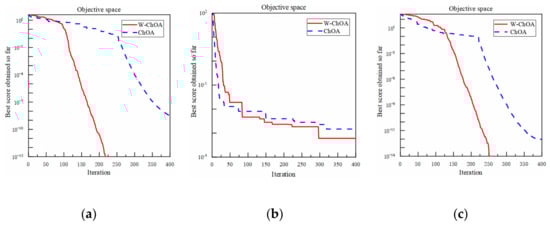 - With these three high-dimensional multimodal test functions, similar conclusions can be drawn. The calculation accuracy and convergence efficiency of the W-ChOA are significantly better than those of the basic ChOA. Test function verification results show that the hunting mechanism of the whale optimization algorithm and the Sobol sequence introduced in the ChOA are practical and successful.