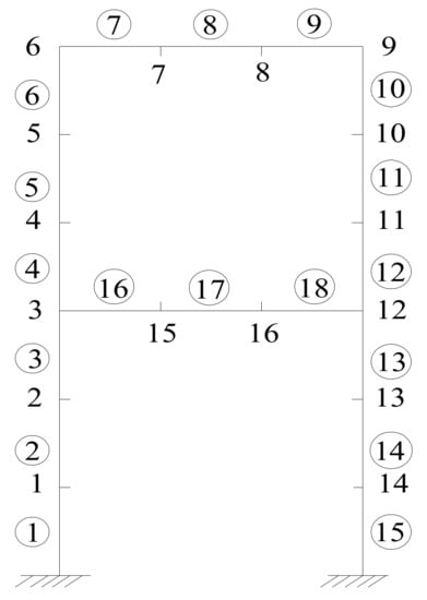 A two-story rigid frame structure is divided into 18 elements, as shown in Figure 4. The numbers in the circles represent the element number and the other numbers represent the node number. To prevent the interference of other factors, the nodes of the two-story rigid frame are all set as steel nodes. The overall degree of freedom of the structure is 16 and the first type of constraint is used to prevent rigid body displacement. Physical parameters of the two-story rigid frame structure are listed in Table 3 as follows: