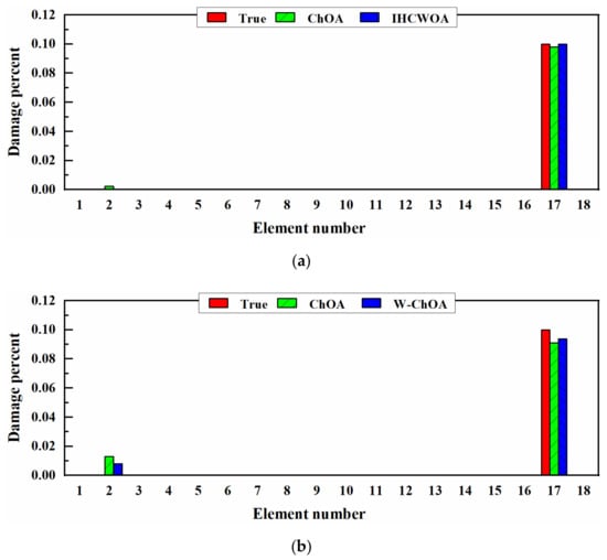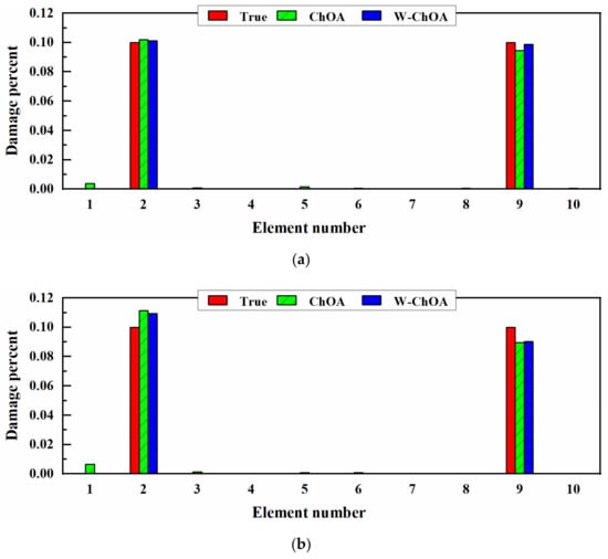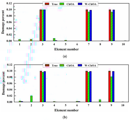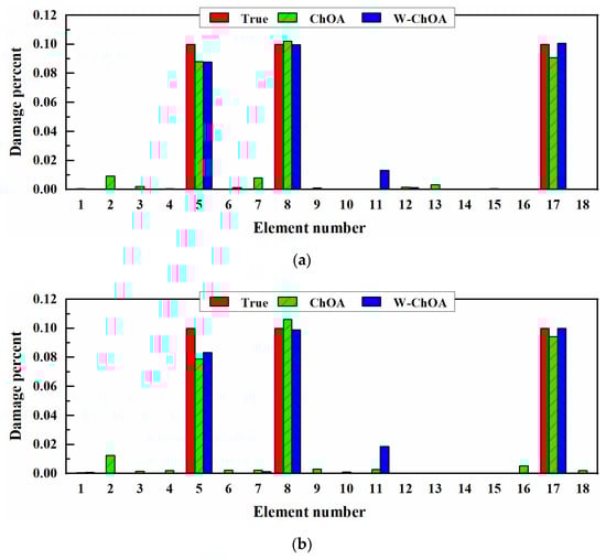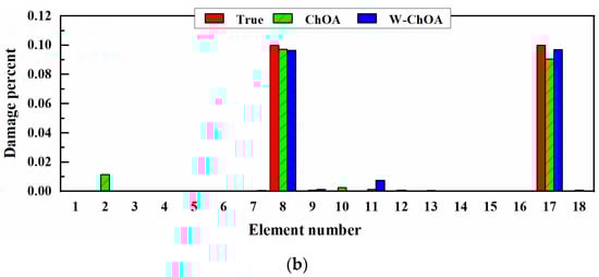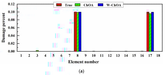 Figure 5 shows the single damage results by the ChOA and the W-ChOA under different noise levels. As shown in Figure 5a, if the damage percent is 10% and the noise level is 5%, the W-ChOA can accurately identify damage location and damage degree at element 17 without misjudgment. In contrast, the identification results of the ChOA have a misjudgment at element 2. As shown in Figure 5b, if the damage percent is 10% and the noise level is 10%, both the ChOA and the W-ChOA have a misjudgment at element 2 and the misjudgment value of the ChOA is greater than the W-ChOA.