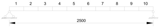 To verify the universality of the proposed method in both asymmetric damage and symmetric damage, a simply supported beam is shown in Figure 8. Physical parameters of the beam are as follows: The beam length , the section width , the section height , the elastic modulus , and the material density . The simply supported beam is divided into 10 elements, each element has two nodes and four degrees of freedom. Assume that the axial deformation is ignored and only the vertical degrees of freedom of each element are extracted from the modal shape during damage detection.