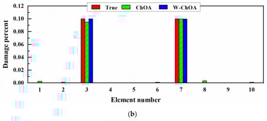 Figure 11 shows the triple damage detection results of the simply supported beam by the ChOA and the W-ChOA under different noise levels. As shown in Figure 11a, if the damage percent is 10% and the noise level is 5%, the W-ChOA can accurately identify damage location and damage degree at element 3, element 7, and element 9 with only one misjudgment at element 4. In contrast, the identification results of the ChOA have four misjudgments in element 1, element 2, element 4, and element 5. As shown in Figure 11b, if the damage percentage is 10% and the noise level is 10%, the ChOA results have five misjudgments. The identification results of the W-ChOA are much better with only two misjudgments in element 1 and element 6.