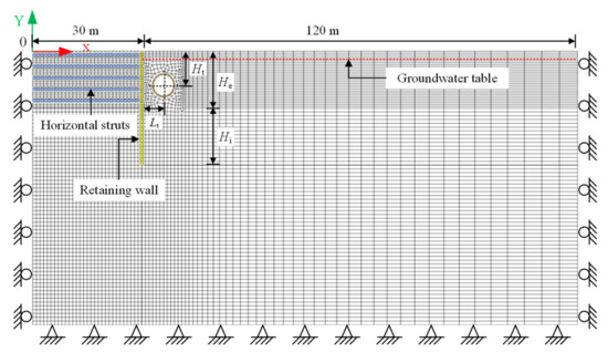In the model, the soil is simulated using a plane strain element, the retaining wall, horizontal struts and existing tunnel are simulated using beam elements, and the contacts of the wall–soil and tunnel–soil are simulated using the interface element. For displacement boundary conditions, the left and right boundaries are limited to the horizontal displacement, the bottom boundary is limited to the horizontal and vertical displacements, and the top boundary is kept free. For load boundary conditions, only the self-weight stress is considered, and no other loads are considered. For water level boundary conditions, the initial groundwater table is 1.5 m below the ground surface, and the pressure head on the groundwater line is 0.