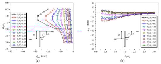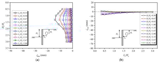 Figure 2b shows the maximum vertical displacement of tunnels at different positions outside the pit, in which a negative value indicates the settlement, and a positive value indicates the heave. It is observed, when Ht/He ≤ 1.33, that tunnel settlement occurs, and the shallower the buried depth, the larger the settlement that occurs. Additionally, when Ht/He > 1.33 and Lt/He ≤ 0.83, tunnel heave occurs, which is induced by the excavation unloading.