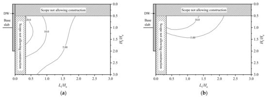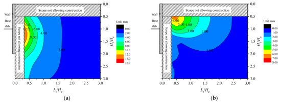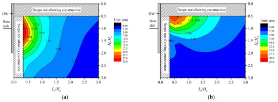 Figure 3 shows the isoline of tunnel horizontal and vertical displacements, in which the tunnel position is normalized by the excavation depth, and the horizontal and vertical ordinates are Lt/He and Ht/He, respectively. Excluding the scope not allowing construction, the value of Lt/He starts from 0.33, and the value of Ht/He starts from 0.5. The isoline presents the horizontal and vertical displacements of the tunnel at different positions outside the pit and, on this basis, the influenced zone of deep excavation on adjacent tunnels can be divided corresponding to different tunnel displacement control standards.