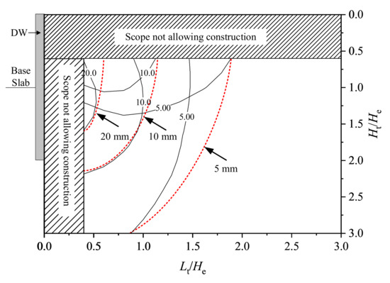 The code CJJ/T 202–2013 [30] provides an early warning value of 10 mm and a control value of 20 mm for the horizontal and vertical displacements of the tunnel, respectively. Additionally, the code GB 50911–2013 [9] requires that the settlement of the tunnel should be controlled within 3–10 mm, the tunnel heave should be controlled within 3–5 mm, and the horizontal displacement of the tunnel should be controlled within 3–5 mm. Here, based on the requirements of the abovementioned codes, the maximum tunnel displacement of 20 mm, 10 mm, and 5 mm were selected as the 3-level tunnel displacement control standards. Then, according to the 3-level standards, determining their corresponding isoline range in Figure 3, i.e., the influenced zone, as shown in Figure 4.