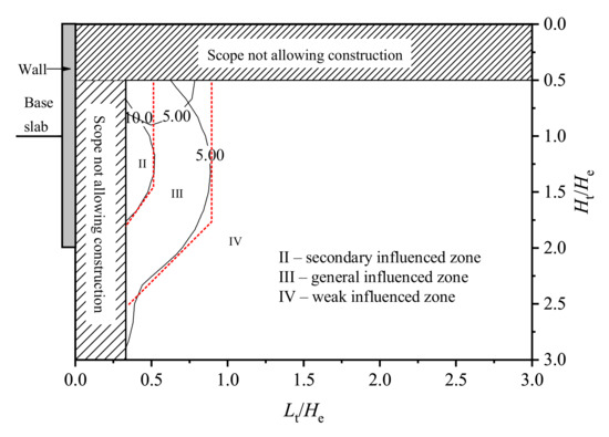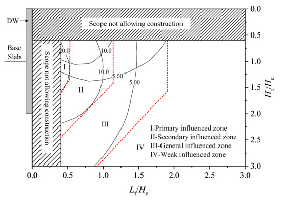 In the code GB 50911–2013 [9], according to the different influence degrees, the range outside the deep excavation is divided into: I—primary influenced zone, II—secondary influenced zone, and III—possible influenced zone. This method is simple and easy to understand, but the parameter for dividing the influenced zone is only the excavation depth H, without considering the other factors such as geological conditions, deformation forms and magnitudes of the retaining structures. Additionally, the intersection line of the pit wall and base slab is taken as the baseline for dividing the influenced zone, which is more suitable for the traditional shallow excavation using the retaining structure of a flexible sheet pile or without a retaining structure. For the deep and large excavations with deeply embedded retaining structures, the rationality of this simplification is debatable.