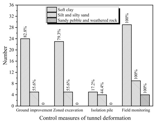 By the collection and statistics of 42 case histories in which the tunnel was affected by adjacent deep excavation, Liu et al. (2022) [23] found the commonly used control measures of tunnel displacement mainly include ground improvement, zoned excavation, isolation pile, and field monitoring in actual engineering. Figure 8 shows the number and proportion of each control measure under different soil conditions. It is observed that the soil condition has a significant effect on the choice of tunnel displacement control measures. The control measures used in sandy pebble and weathered rock strata with good properties are much less than those used in soft clay, silt, and silty sand strata with poor properties. In soft clay strata, except for field monitoring, ground improvement is the most widely used control measure. Therefore, ground improvement was chosen to study the control effects on the tunnel displacement and influenced zone of deep excavation.