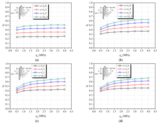 Figure 13 shows the evolution curves of ηh with w. It is observed that under the four conditions with different h values, ηh increases linearly with w, and the greater the ground improvement strength qu is, the more obvious the increase of ηh is obtained. Under the condition of h = 1.5Ht, when the w increases from Lt/6 to 2Lt/3, the ηh value has a maximum increase of 100%. Under the conditions of h = 2.0Ht, h = 2.5Ht and h = 3.0Ht, when w increases from Lt/6 to 2Lt/3, the ηh value has a maximum increase of 70%, 55%, and 48%, respectively.