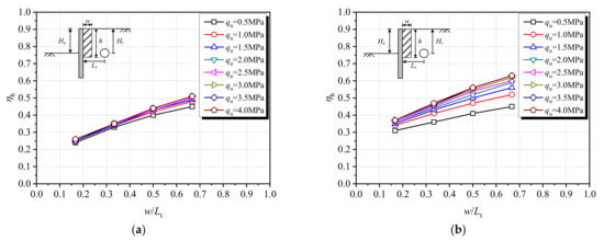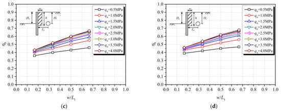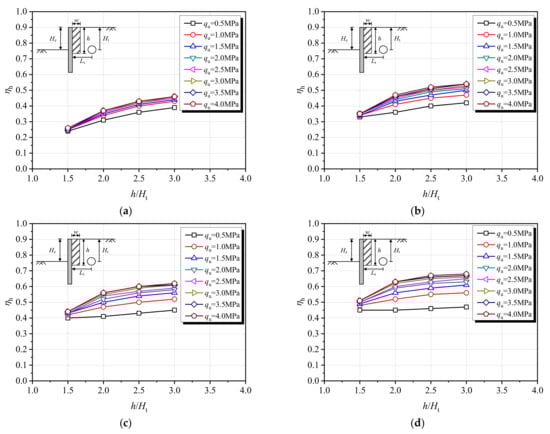 Figure 10 shows the evolution curves of ηh with qu. It is observed that under the four conditions with different h values, ηh increases nonlinearly with qu, and the larger w is, the greater the increase in ηh that is obtained. Under the condition of h = 1.5Ht, ηh increases slightly with qu, and it has a maximum increase of 13% when qu increases from 0.5 MPa to 4.0 MPa. Under the conditions of h = 2.0Ht, h = 2.5Ht, and h = 3.0Ht, ηh increases obviously before qu = 1.5 MPa and then gradually slows down, and it has a maximum increase of 40%, 44%, and 45% when qu increases from 0.5 MPa to 4.0 MPa.