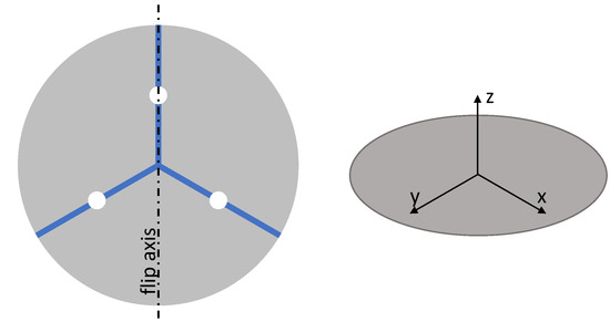The reference method, as proposed in the SEMI standards [3,7], is usually applied to a one-point or a three-point support setup. When the wafer’s front surface points upward, it is denoted normal orientation, and when the front face points downward, it is denoted inverse orientation. When the wafer is flipped to change from normal to inverse orientation, the flip axis must be chosen carefully so that the relative position of the supports and the wafer remains unchanged (Figure 1). This is achieved by selecting the axis so that the flip operation maintains even symmetry. In a centered one-point support, any axis can maintain even symmetry. However, in a regular three-point support setup, only the axes passing through the center and any of the contact points maintain even symmetry.