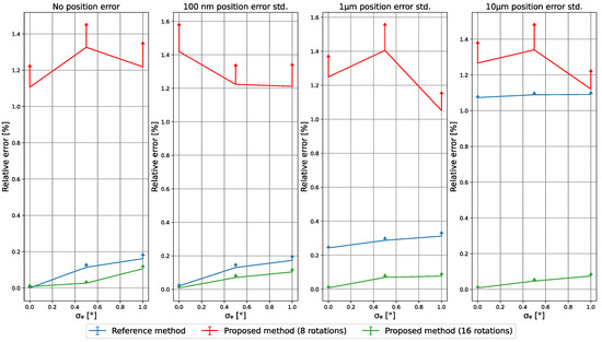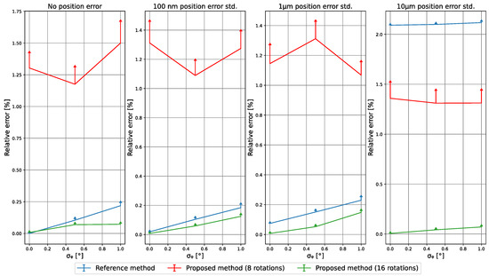 The results summarized in Figure 5 are obtained after averaging 100 measurements for each condition of misalignment angle standard deviation and support position error . In this first set of measurements, the position error is set to be independent for each support . The sampling interval is set to 0.1 mm. Three methods are compared in regard to their ability to remove gravity-induced effects: the reference method [6], the proposed method with 8 rotations (N = 8), and the proposed method with N = 16.