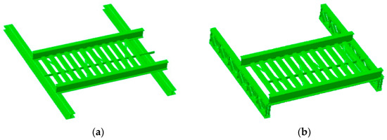 The overhead system has a total length of 80 m and a standard span of 8 m. For the consideration of calculation efficiency, the influence of the three-span overhead system was calculated. The total length of the overhead architecture model along the track line direction is 24 m, which is divided into 12 m and 9 m along the road direction of the frame bridge. The 12 m transverse girder was arranged in two spans of 7 m + 5 m. A B32 three-dimensional beam element was used to discretize the structure. The concrete sleeper has little effect on the stiffness of the structure, which is simplified in the model as a mass element applied to the relevant rail beam joints. The joints are rigidly joined, and nodal plates and rivets were not taken into consideration. The finite element numerical models of the two types of overhead systems are shown in Figure 5.