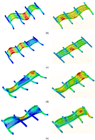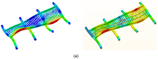 The first five primary modes of the overhead system are compared in Figure 6a–e. On the left is the result of the ABAQUS calculation, and on the right is the result of the MIDAS/civil calculation. The first ten natural vibration periods of the models created by the two software programs are not different, as can be seen from the eigenvalue analysis data and vibration mode diagram in the above table. This shows that the simulation of the overhead system’s mass and stiffness is essentially consistent, and it can be determined that the models created by Midas/civil and ABAQUS are essentially accurate.