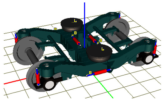 Figure 8 represents the bogie model. UM employs substructure modeling, defining the bogie and its attached wheelsets and suspension as a substructure that is repeatedly invoked in subsequent modeling. The front view and side view of the train dynamics model are shown in Figure 9. The passenger train and freight train entire train models have been established in UM, and the model diagram is shown in Figure 10.