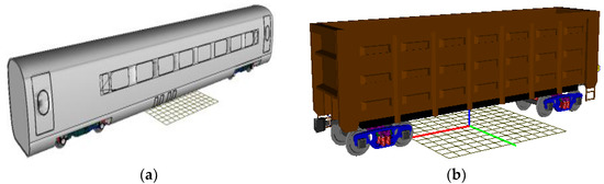 There are two different types of single-section train modeling, for freight trains and passenger trains, respectively. The choice of normal-speed trains and heavy-load trucks is mentioned in reference [15]; the heavy-load truck uses C80 in this paper. The trained model is created to determine the characteristics of each train component as well as the connection relationships between each component based on the rigid body establishment, force element definition, constraints application, and determination of wheel and rail contact. Later, the equation for the dynamics of the train system is assembled and created [16]. The train modeling makes three assumptions: (1) the train body, bogie, and wheel equivalent train components are rigid bodies; (2) each part of the train body is symmetric about the train body’s axis; and (3) the connection between bogie and wheelset, bolster, and train body only considers linear performance, which is simplified as the spring plus damping structure.