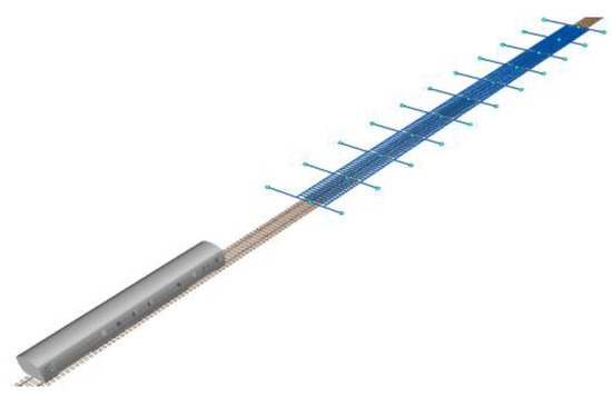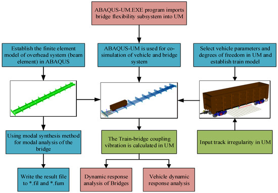 ABAQUS was used to calculate and output the mass matrix, stiffness matrix, and modal information of the overhead system, with a format of *.FIL. A 3D train model is established in UM, and the overhead system model established is imported through the ABAQUS interface provided by UM. The training model in UM is coupled through wheel-rail contact. The established train-track-bridge multi-body system model is shown in Figure 12. The process of joint simulation is shown in Figure 13.