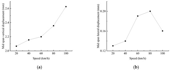 Mid-span displacement response under different speed levels (unit: mm): (a) Mid-span maximum vertical deflection. (b) Mid-span lateral displacement.